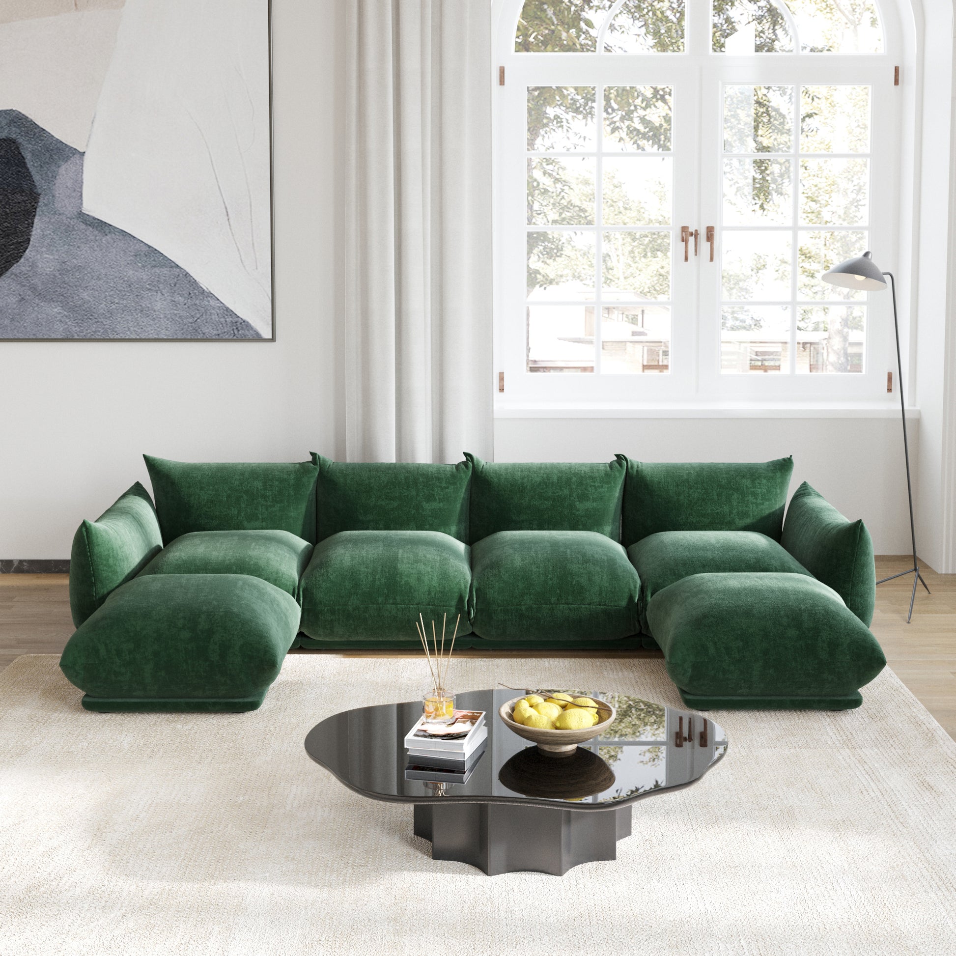 The Verona 6-Seat Chenille Modular U-Shaped Sectional transforms your living space into a sanctuary of softness and style. Designed for family gatherings or quiet nights in, it offers expansive seating and a low, relaxed silhouette that defines modern comfort. The chenille upholstery adds a rich, tactile finish that feels both elegant and cozy.
