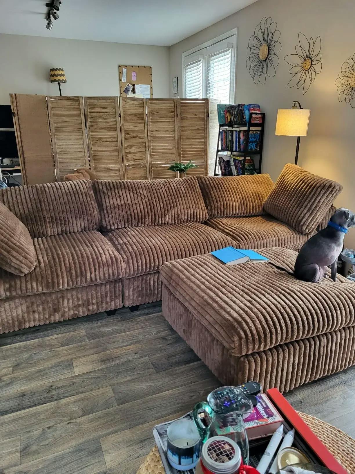 Brown L-shaped sectional sofa in a room with large windows and a view of trees.