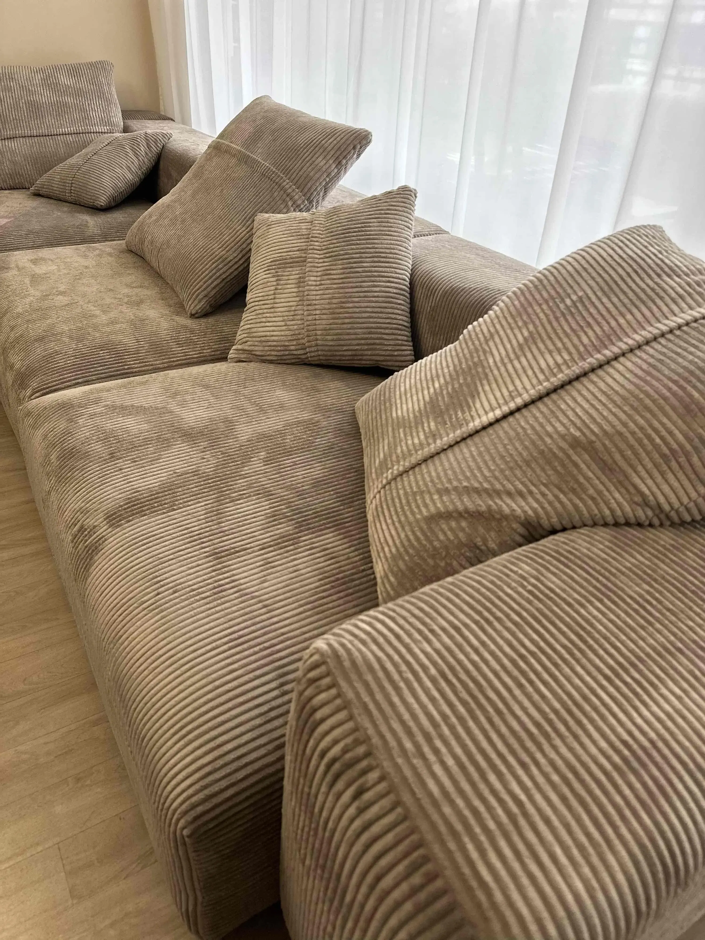 A brown L-shaped corduroy modular sofa with detachable armrests and removable covers, pet-friendly, displayed in a bright living space.