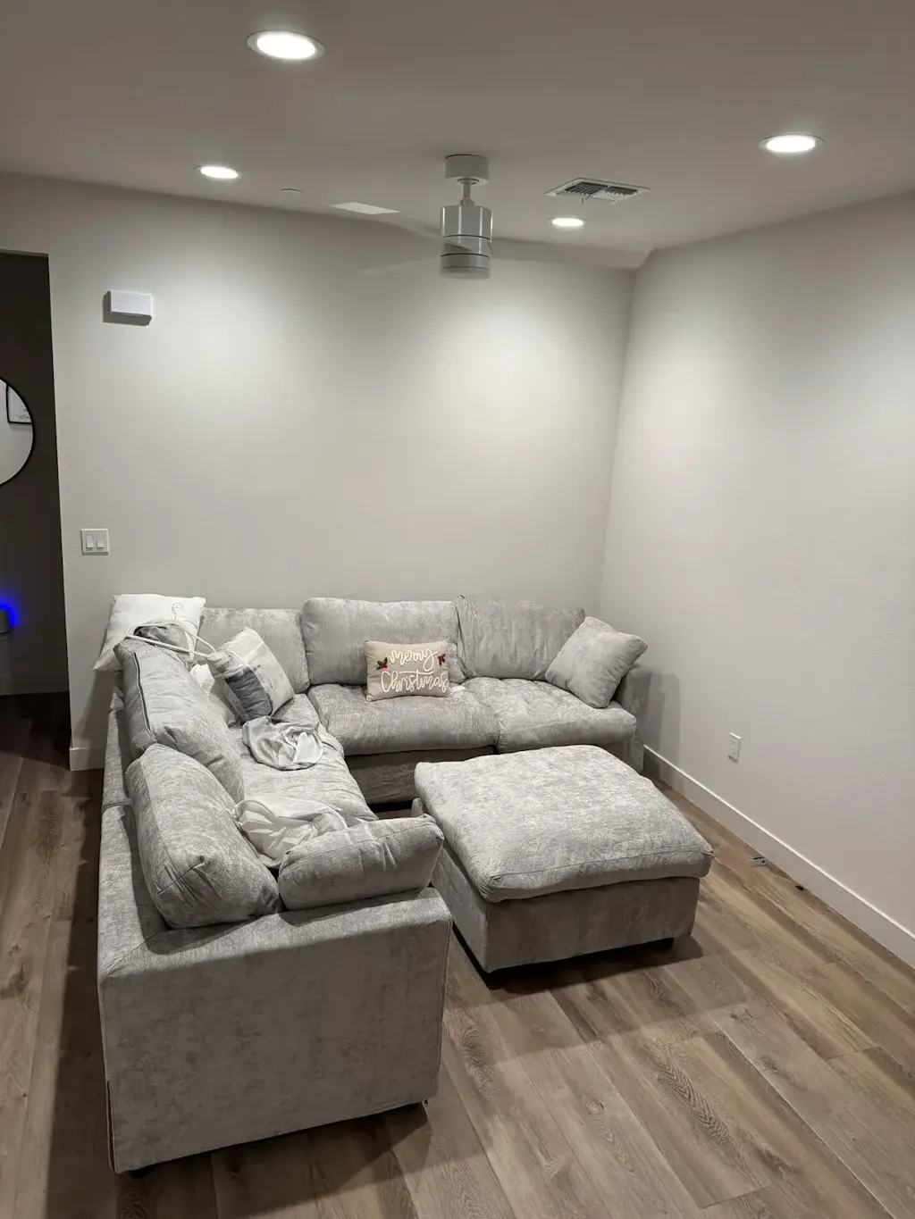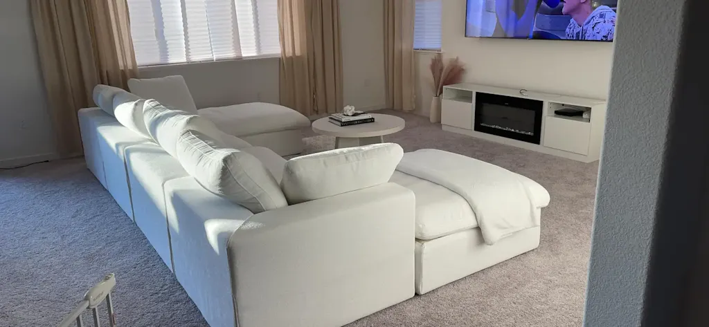 Track arms wrap naturally around the corner in chenille-linen blend. Foam bead cushions, 21.65" seat depth, spring-wrapped frame. Every cover unzips and machine-washes. Ships free from Los Angeles in 3–7 days.